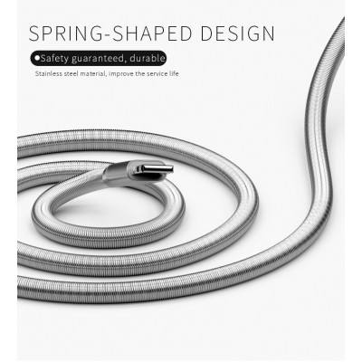 Цельная металлическая оплетка в виде пружины обеспечивает жесткость кабеля и высокую устойчивость к растрескиванию и разрушению.