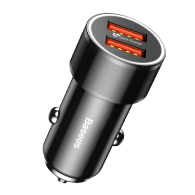 Автомобильное зарядное устройство Baseus Small Screw обладает высокой мощностью на выходе - 36 Вт, а также оснащено двумя USB портами для одновременного подключения нескольких устройств. Продуманная интеллектуальная микросхема внутри устройства гарантирует быстрый и безопасный процесс зарядки для вашего смартфона. Автозарядка Baseus Small Screw оснащена дополнительной LED-подсветкой, по периметру корпуса, что позволяет использовать её в темное время суток или при плохом освещении. Мягкий свет автозарядки не слепит, и позволяет быстро найти зарядный порт во время движения ночью. Корпус устройства изготовлен из прочного алюминия, поэтому внешние царапины и удары ему не страшны. Кроме того, он обладает достаточно компактными размерами, что, несомненно, есть большим плюсом для такого аксессуара, поскольку занимать он будет очень мало места.