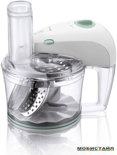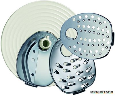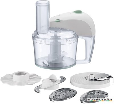 Терки: для драников; шинковки; нарезки; диск для взбивания; ножи для измельчения.!. Кухонный комбайн электрический, мощность 350 Вт, 5 насадок, система MicroStore. Цвет белый со светло-зелеными вставками