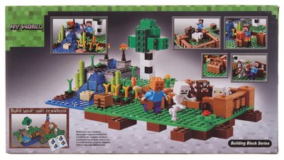В набор входит минифигурка Стива с различными аксессуарами, скелет, корова и овца.