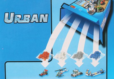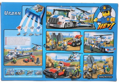 Двое грабителей выехали за пределы города и пытаются скрыться с похищенными деньгами и золотом. Один из них мчится по обочине на своём скоростном салатовом мотоцикле, а другой хочет свернуть в сторону скал, чтобы в пещере спрятать свой спортивный красный багги. Но, отряд полиции быстрого реагирования уже в пути! При помощи небольшого вертолёта они выслеживают преступников и готовятся к задержанию. Из деталей конструктора собирается: большой полицейский грузовик и вертолёт, спортивный автомобиль и мотоцикл преступников. В наборе 4 фигурки.