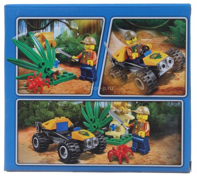 Из деталей конструктора BELA City "Багги для поездок по джунглям" Вы сможете собрать модель маневренного багги. Спереди багги виден треугольный капот, на котором располагаются круглые фары и эмблема исследователей джунглей. За капотом устроена открытая кабина, состоящая из синего водительского кресла и рулевого управления. Багажник транспортного средства оборудован креплениями, с помощью которых можно перевозить рабочий инвентарь.
