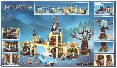 В набор Harry Potter Гремучая Ива Хогвартса входит: Гремучая Ива, машина Гарри и Рона с открываюшимися дверями и багажником, часть замка Хогвартс с кабинетом профессора и кабинетом зельеварения, в котором полно всевозможных бутылочек для магических опытов.