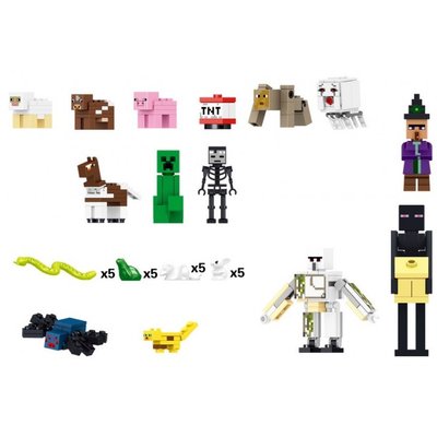 В наборе Майнкрафт собраны все персонажи мира Майнкрафт. Это самый большой набор серии по количеству минифигурок. Здесь Вы найдете не только главных героев Стива и Алекса, но также и зомби, криперов, скелетов и прочих существ. Всего в наборе 28 героев.