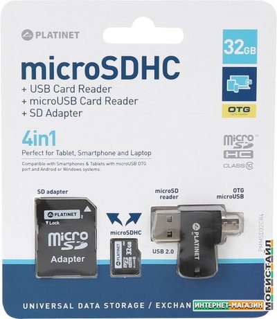 Карта памяти Platinet PMMSD32CR4 32GB + адаптер, кардридер
