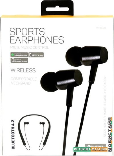 беспроводные наушники с микрофоном, портативные/спортивные, оформление закрытое, излучатель 10 мм, 20-20000 Гц, 16 Ом, расстояние 10 м